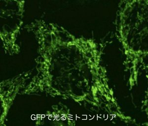 ポスターにある写真は、ムラサキゴテンというツユクサの仲間の葉っぱです。細胞一つ一つが異なる色をしていてきれいです。でも、これを蛍光顕微鏡という顕微鏡で見ると、さらにいろんな色で光っているのが判ります。実は世の中にあるたいていのものは光を当てると光るんですよ。白い紙は蛍光剤を含ませることでより白く見えたりします。蛍光顕微鏡はその光だけを観察する顕微鏡です。ノリ網の観察にも使われているんですよ!この蛍光顕微鏡、実は今の生物研究には欠かせない道具です。下村修先生のノーベル賞受賞で有名になった蛍光タンパクGFPを見るのに使うんです。下の写真はミトコンドリアが光るように遺伝子操作をした細胞です。どうです?自分の目でミトコンドリアを見たって自慢できるぞ!